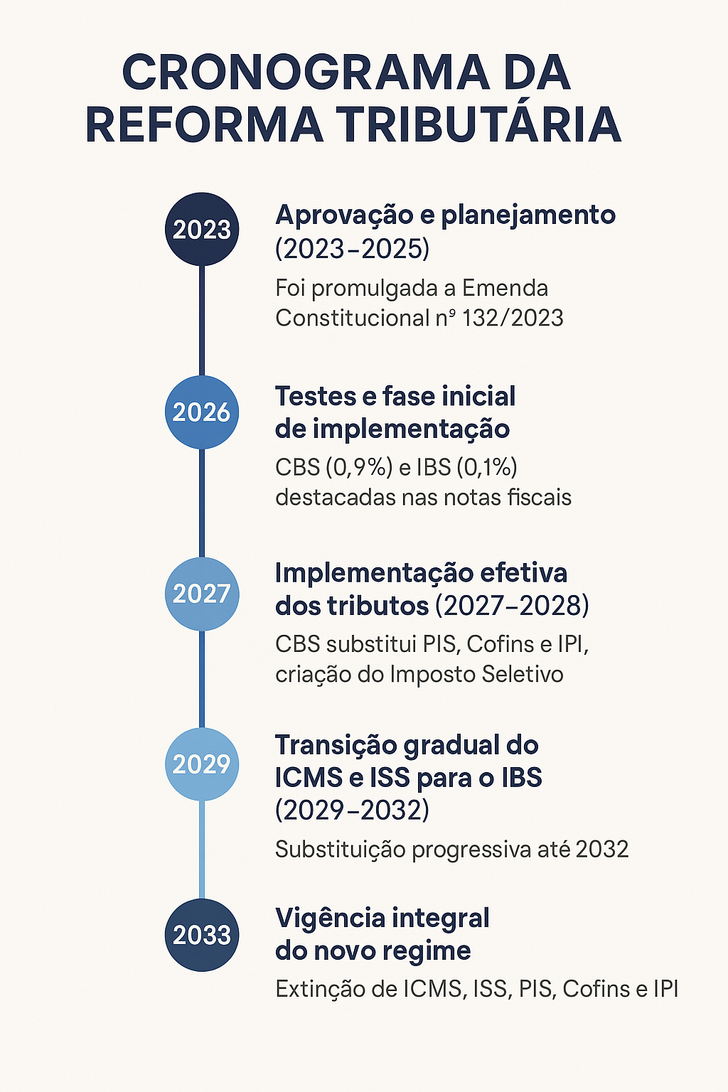 1. Aprovação e planejamento (2023–2025) 2. Testes e fase inicial de implementação (2026) 3. Implementação efetiva dos tributos (2027–2028) 4. Transição gradual do ICMS e ISS para o IBS (2029–2032) 5. Vigência integral do novo regime (a partir de 2033) 📋 Resumo em tabela Período Fase / Evento 2023–2025 Aprovação (Emenda Constitucional 132/2023) e regulamentação […]
